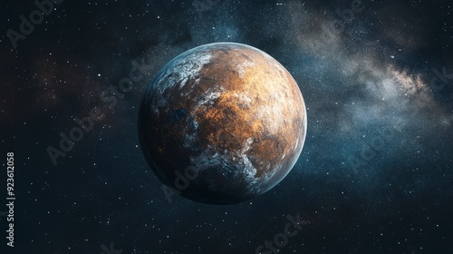A detailed view of a planet in space, showcasing textures and cosmic surroundings.