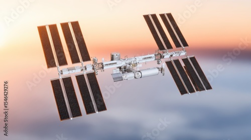 A detailed view of a space station surrounded by soft pastel clouds during sunset, showcasing advanced solar panels, Ideal for educational content, space exploration articles