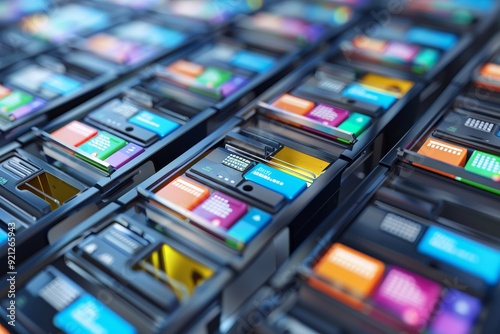 A detailed view of a stack of vibrant ink cartridges, Illustrate the importance of regular data backups for business continuity
