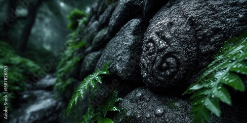 A detailed view of an ancient stone wall covered in moss and lush green ferns.