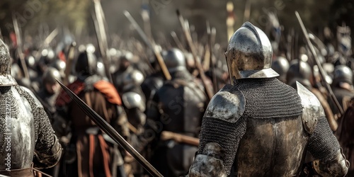 A detailed view of armored warriors gathered for a medieval battle, showcasing historical attire and weaponry in a dramatic setting.