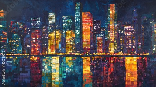 A detailed view of office towers at night in NYC, their illuminated windows forming dynamic patterns, sleek glass reflecting the city below; medium angle, radiant night hues.