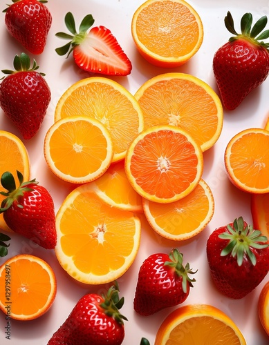 A detailed view of sliced fruits like oranges and strawberries, with vibrant colors glowing, showcasing the fresh textures and juicy interiors.