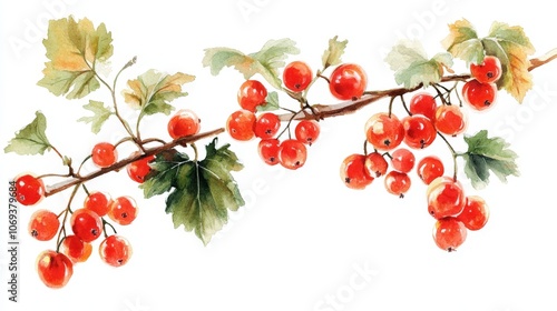 A detailed watercolor illustration depicts a branch laden with red currants and lush green leaves, showcasing the fruits' vibrant color and fine texture