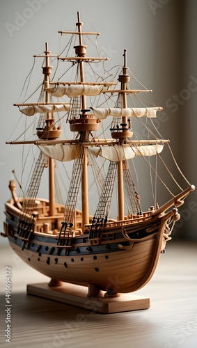 A detailed wooden ship model stands proudly, meticulously crafted with precision and artistry, capturing the essence of maritime heritage and craftsmanship.