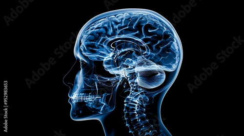 A detailed x-ray illustration of the human brain and spinal cord, showcasing anatomical structures.