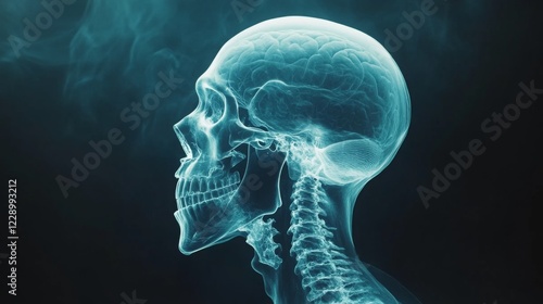 A detailed x-ray image of a human skull in profile, showcasing the structure of the head, jaw, and spine against a dark background.