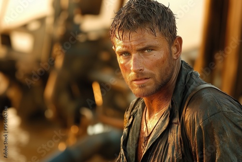 A determined man with a rugged appearance is seen working in intense conditions, his face and clothing covered in dirt and sweat.