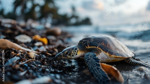 A determined sea turtle crawls through a rocky beach terrain towards the vast ocean, capturing the essence of persistence and natural beauty during sunset.