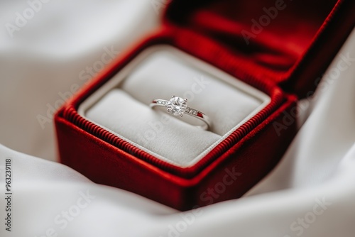 A diamond ring in a red velvet jewelry box.