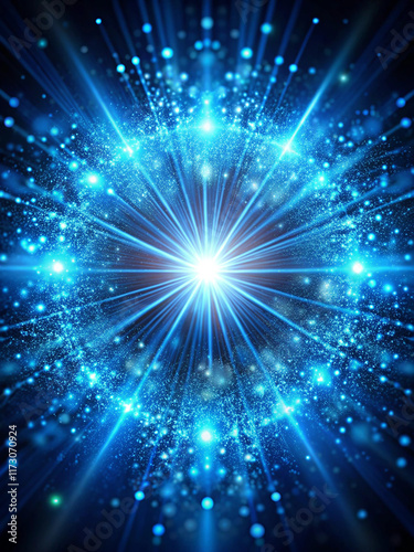 A digital abstract composition with glowing blue particles and soft light rays emanating from a central focal point