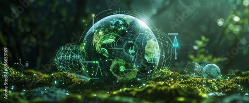 A digital art representation of the environment, featuring icons representing green energy and environmental protection.