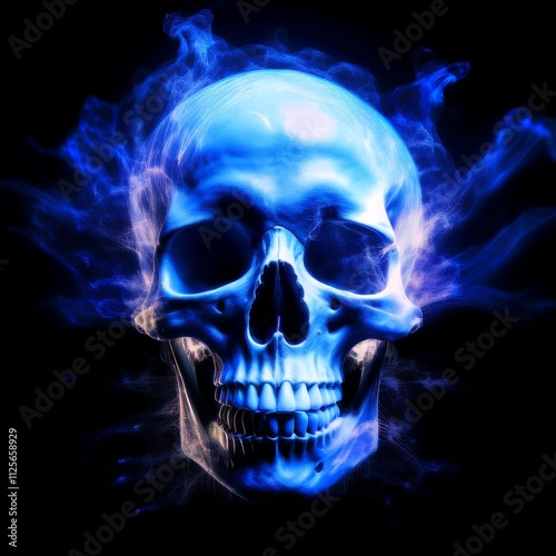 A digital artwork depicting a skull engulfed in ethereal blue smoke. Dark, mysterious, and captivating.