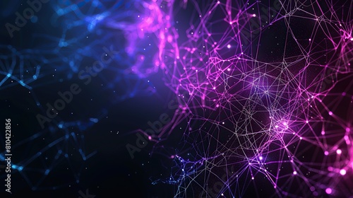 A digital canvas illuminated by a network of glowing purple and blue lines creating a deep space plexus effect on a black background with a designated space for text in the lower right corner