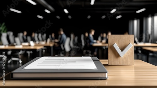 A digital checkmark indicates accomplishment within a stylish office environment featuring ample natural light and plant decor