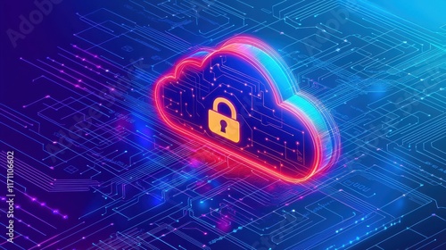 A digital cloud with a padlock symbolizes secure cloud storage and data protection amidst a vibrant, tech-inspired background.