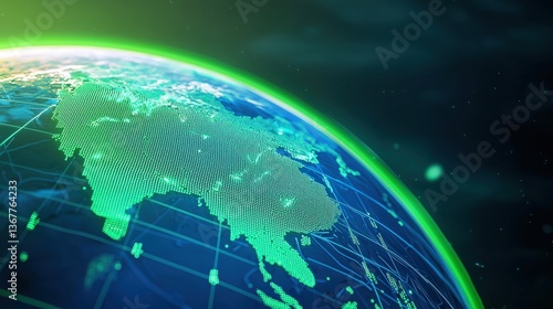 A digital depiction of Earth featuring a glowing green outline, emphasizing the continents and grid lines, set against a dark background, Green Technology.