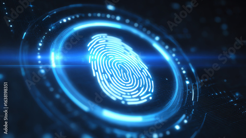 A digital fingerprint on a blue glowing background representing security and biometric technology.
