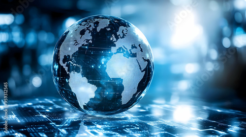 A digital globe on a circuit board with glowing lights, symbolizing global connectivity and digital technology.