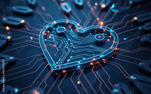 A digital heart on a circuit board, symbolizing technological love and innovation. The intricate details of the circuit board glow with an electric blue light