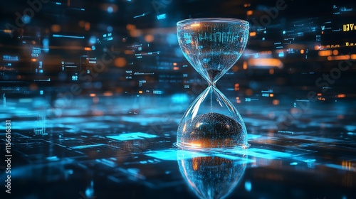 A digital hourglass symbolizing the passage of time in a tech-inspired landscape.