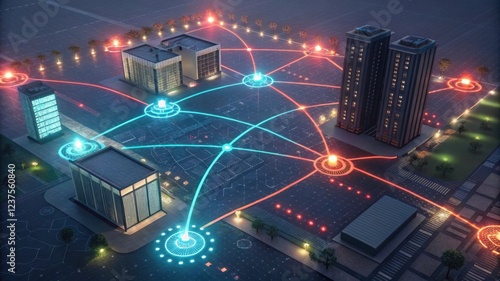 A digital illustration depicting a network of buildings interconnected by vibrant blue and red lines, symbolizing data flow and connectivity in a modern urban setting.