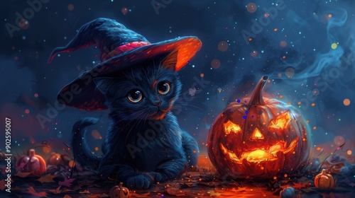 A digital illustration of a black cat wearing a witch hat sitting beside a glowing jack-o'-lantern with colorful confetti and smoke.