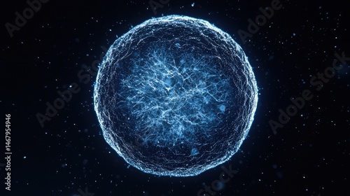 A digital illustration of a blue sphere with a network of lines and dots against a black background.
