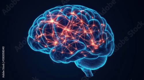 A digital illustration of a brain with glowing neural connections, representing intelligence, cognition, and the complexity of the human mind.
