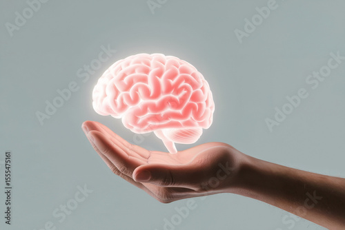 A digital illustration of a glowing pink brain floating above an open palm against a light gray background