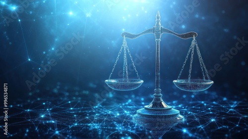 A digital illustration of a justice scale symbolizing law and fairness in a modern, high-tech environment.