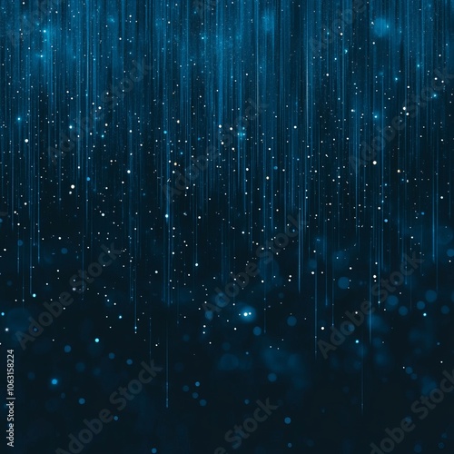 A digital illustration of blue vertical lines and floating particles resembling rain.