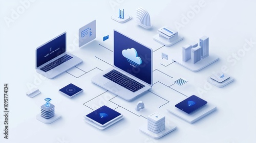 A digital illustration of cloud computing with interconnected devices and data flow.