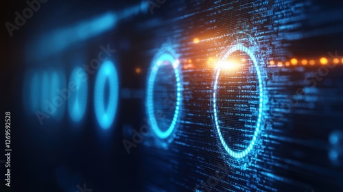 A digital interface displays glowing blue circles against a backdrop of data streams, suggesting a futuristic technology theme.