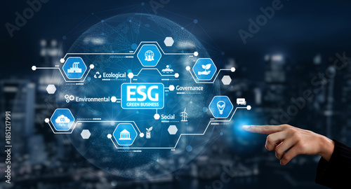 A digital interface representing Environmental, Social, and Governance principles showcases user interaction in a modern business concept highlighting sustainability initiatives. Tessel