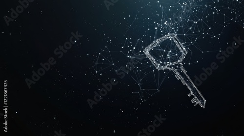 A digital key design emerges from particles against a dark background, symbolizing security and unlocking potential.