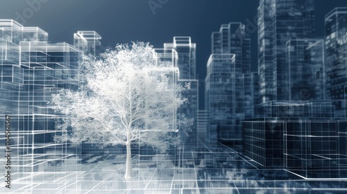 A digital landscape featuring a solitary tree amidst a futuristic cityscape.