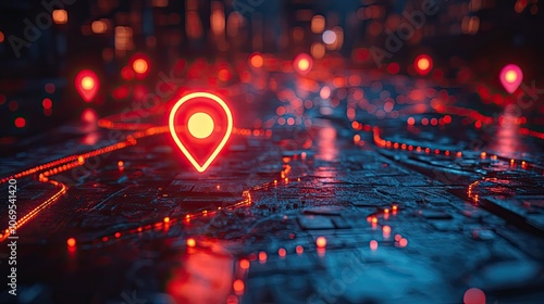 A digital map displays a location with two pins, representing AI technology in GPS innovation, focusing on delivery services and future logistics transportation systems.