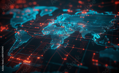 A digital map of Europe, Africa, and Asia with glowing blue and red data points and network lines.