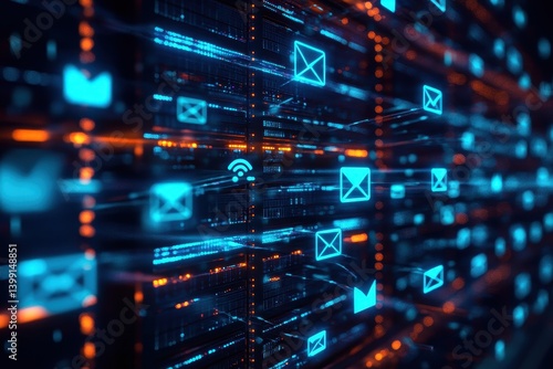 A digital network with glowing blue email icons and orange lines showing data transfer activity