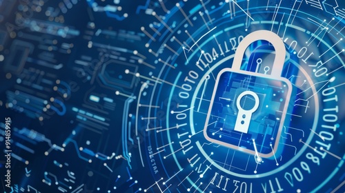 A digital padlock illustration with binary code and futuristic circles on a blue and white background, concept of cybersecurity