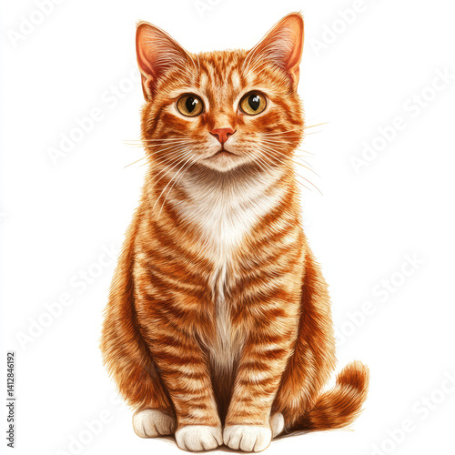 A digital painting of a ginger tabby cat sitting upright on a white background