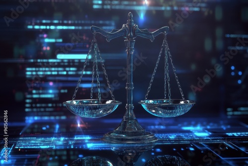 A digital rendering of the Scales of Justice, placed in a futuristic setting