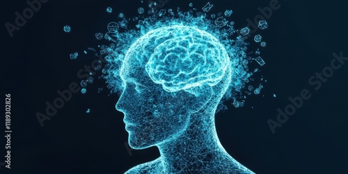 A digital representation of a human head with a glowing brain, symbolizing intelligence and creativity, surrounded by particles.