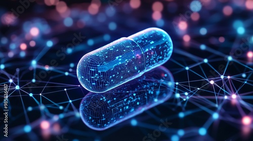 A digital representation of a pill on a network background symbolizes ai-driven precision medicine