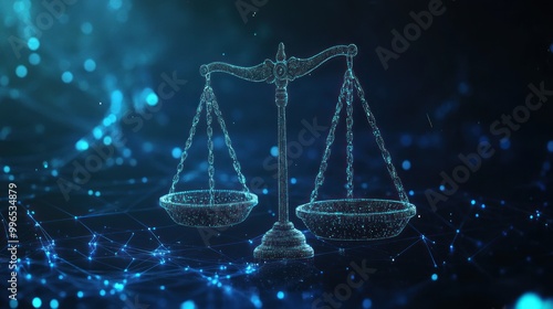 A digital representation of balanced scales symbolizing justice and equality, set against a futuristic, tech-inspired background.