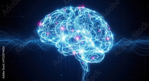 A digital scene design showcasing an AI brain made of particle light for learning.