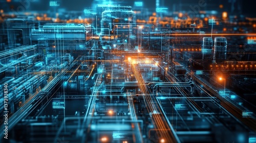 A digital twin technology concept featuring real-time simulations, interconnected smart devices, and predictive analytics