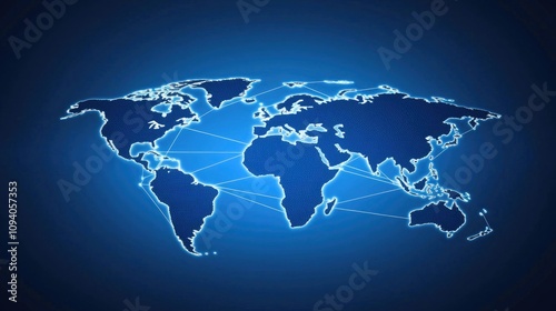 A digital world map illuminated in blue, showcasing global connectivity through a network of lines connecting various regions.