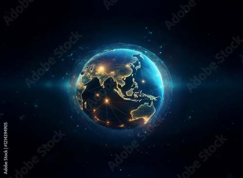 A digitally enhanced image of Earth, glowing with interconnected lines representing global communication networks, set against a dark space background. The continents are subtly visible beneath the n